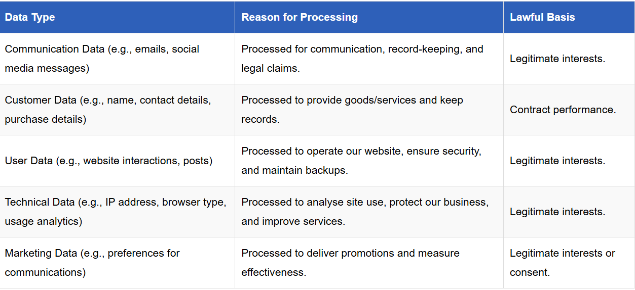 We may also use Customer, User, Technical, and Marketing Data to tailor website content and advertisements. Lawful basis: Legitimate interests (business growth).